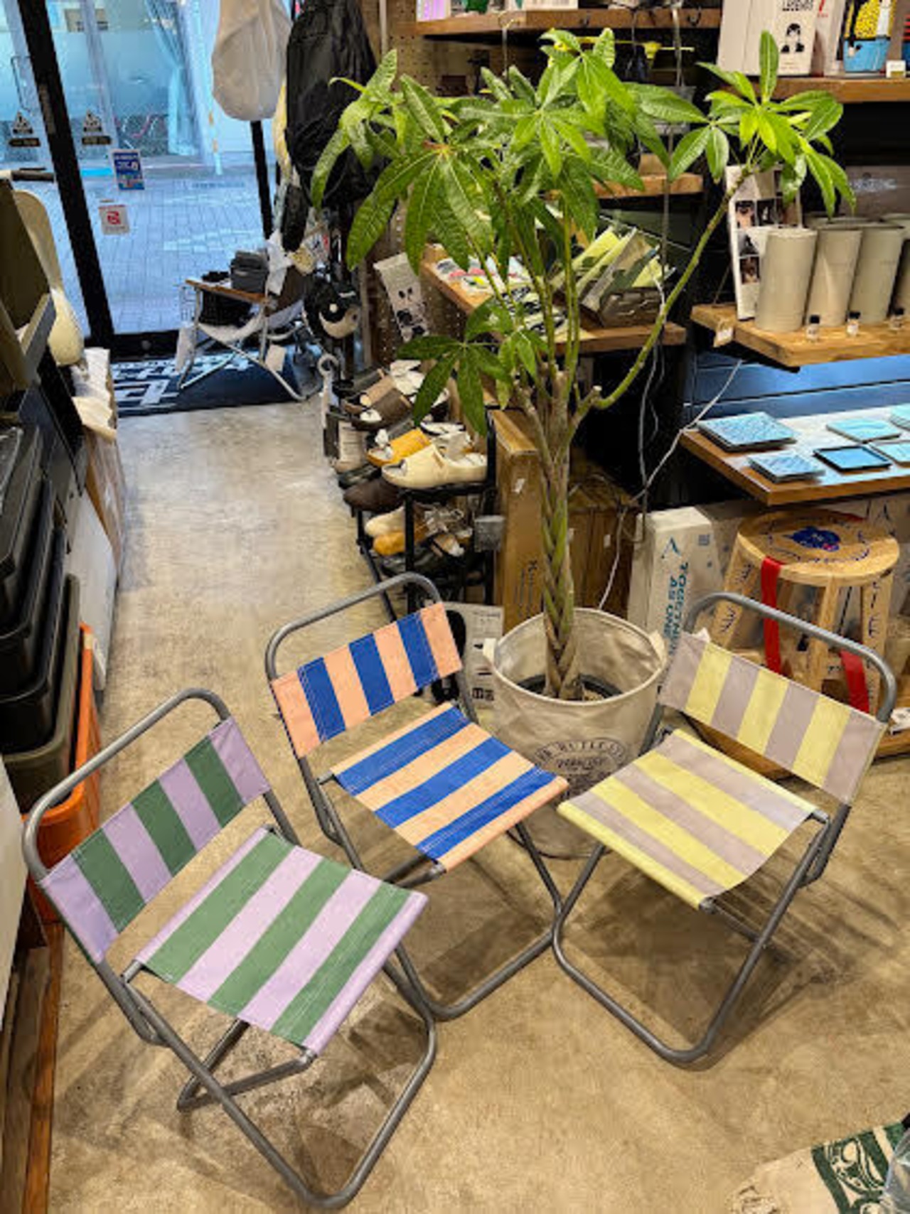 カラフルなストライプ柄の折りたたみ可能なチェアです。