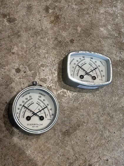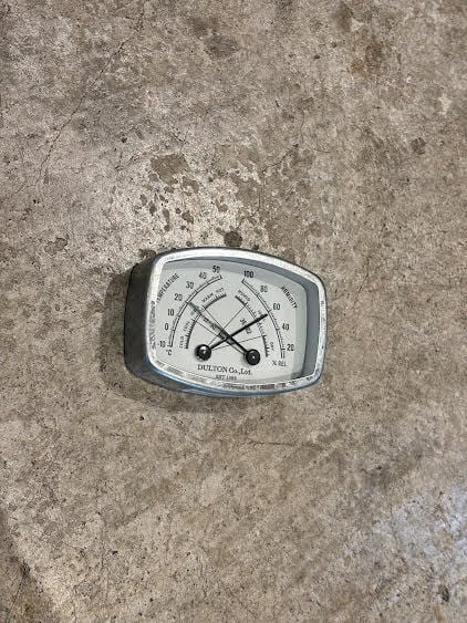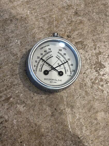 クールなスチール素材と遊び心が散りばめられた文字盤がマッチした温湿度計です。