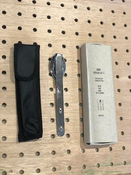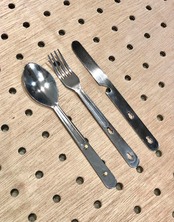 アーミータイプのアウトドアカトラリーセットです。スプーン・フォーク・ナイフ・ボトルオープナーがセットになっています。穴に合わせて、上にスライドさせると固定されます。アウトドアシーンで大活躍してくれるアイテムです。